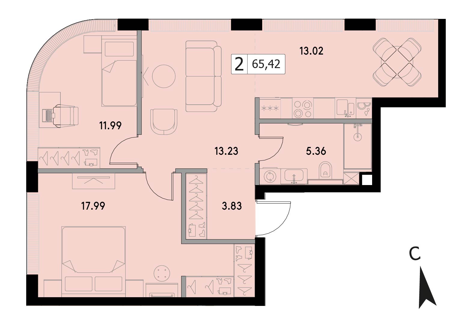 В продаже 2-комнатная квартира без отделки на 14 этаже, Корпус 1.2.