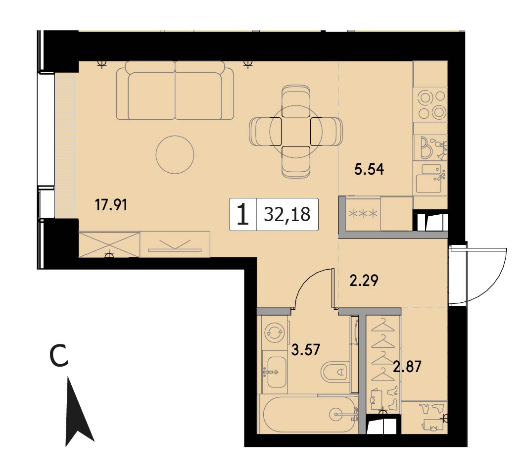 В продаже 1-комнатная квартира без отделки на 32 этаже, Корпус 1.5.