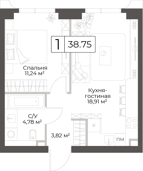 В продаже 1-комнатная квартира без отделки на 4 этаже, Корпус 1.
