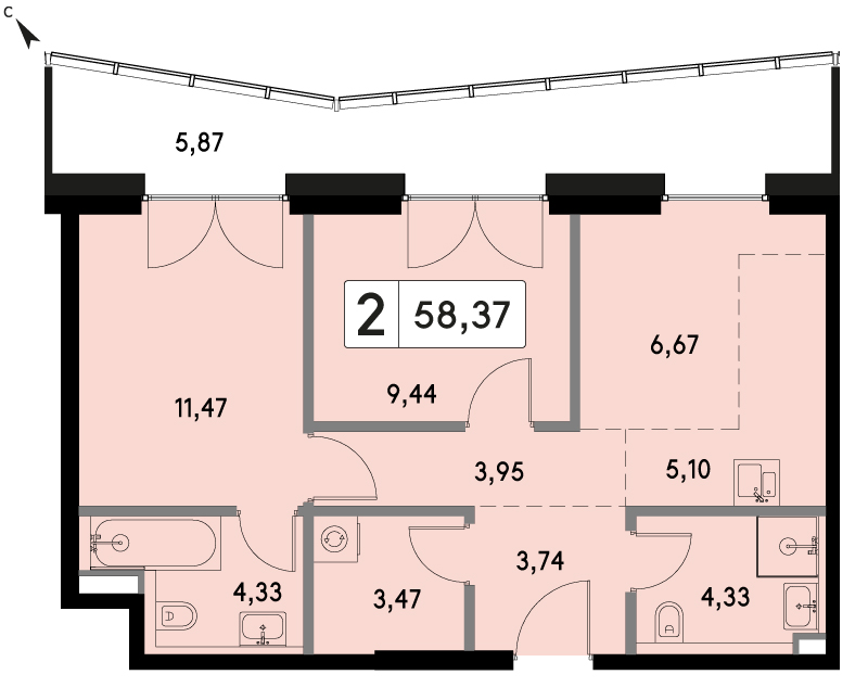 В продаже 2-комнатная квартира без отделки на 28 этаже, Корпус 1.