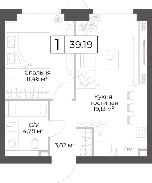 В продаже 1-комнатная квартира без отделки на 7 этаже, Корпус 1.