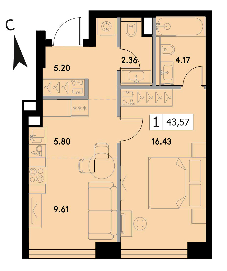 В продаже 1-комнатная квартира без отделки на 35 этаже, Корпус 1.3.