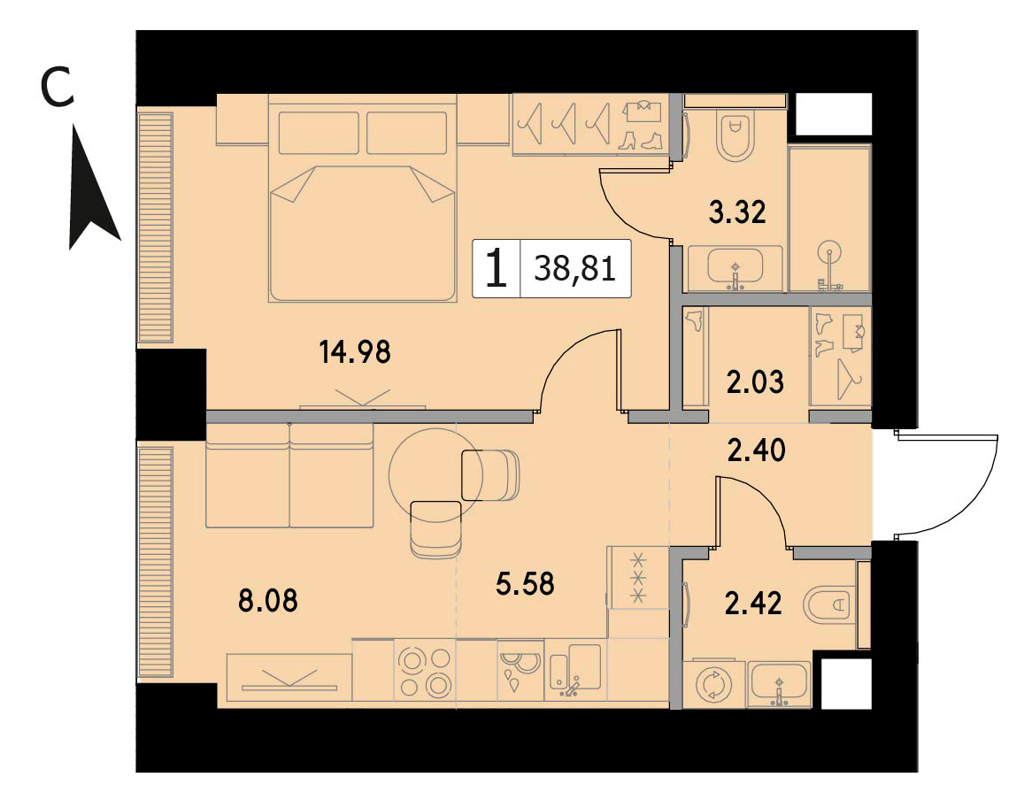 В продаже 1-комнатная квартира без отделки на 8 этаже, Корпус 1.3.