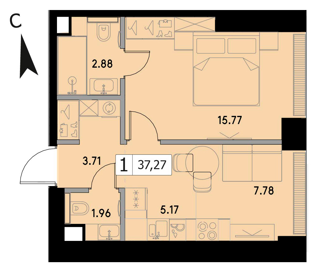 В продаже 1-комнатная квартира без отделки на 29 этаже, Корпус 1.3.