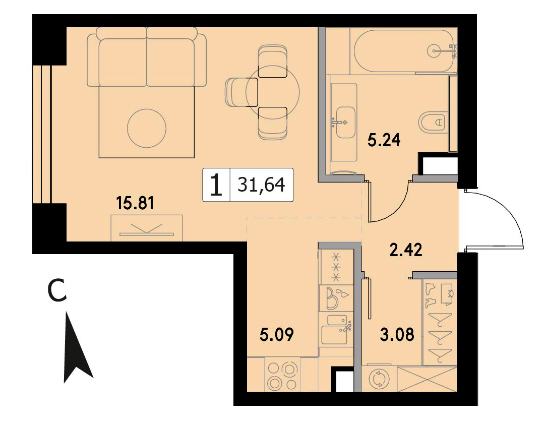 В продаже 1-комнатная квартира без отделки на 35 этаже, Корпус 1.3.