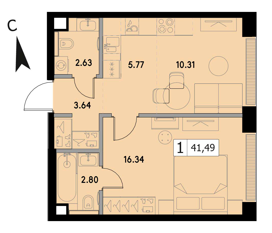 В продаже 1-комнатная квартира без отделки на 63 этаже, Корпус 1.3.