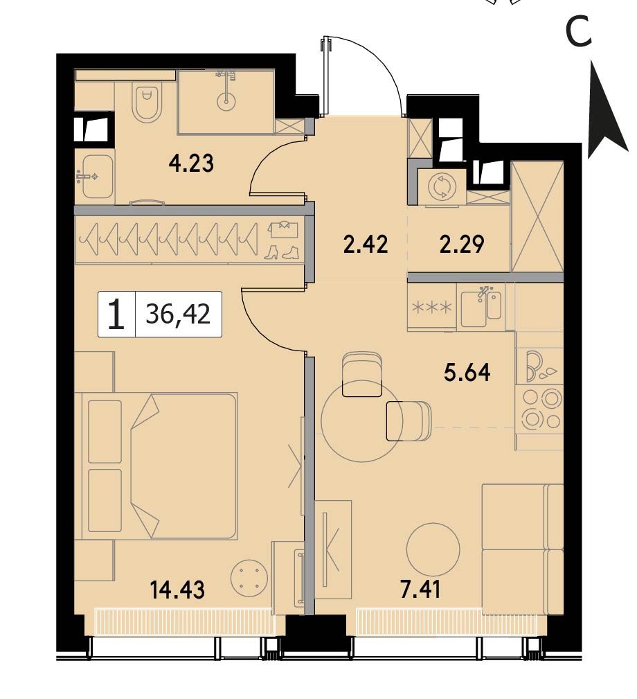 В продаже 1-комнатная квартира без отделки на 28 этаже, Корпус H.
