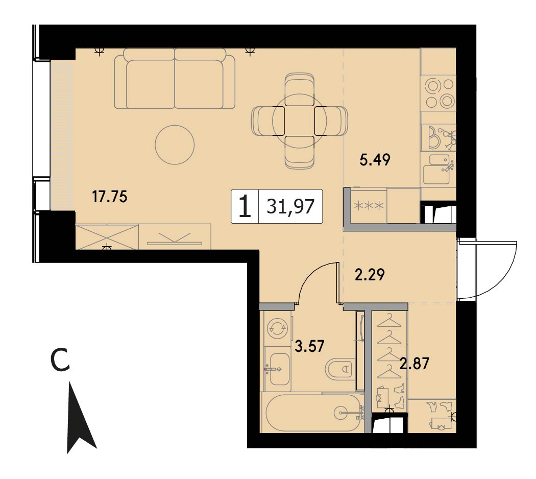 В продаже 1-комнатная квартира без отделки на 29 этаже, Корпус 1.3.