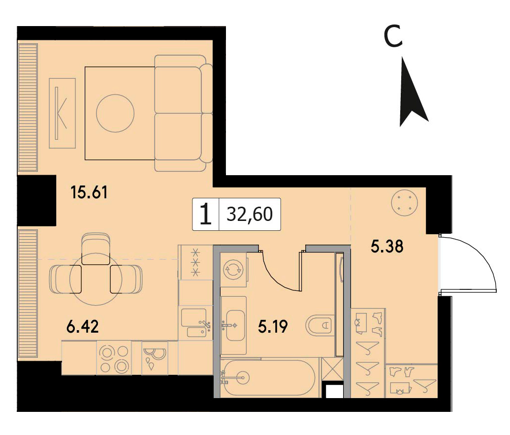 В продаже 1-комнатная квартира без отделки на 32 этаже, Корпус 1.5.