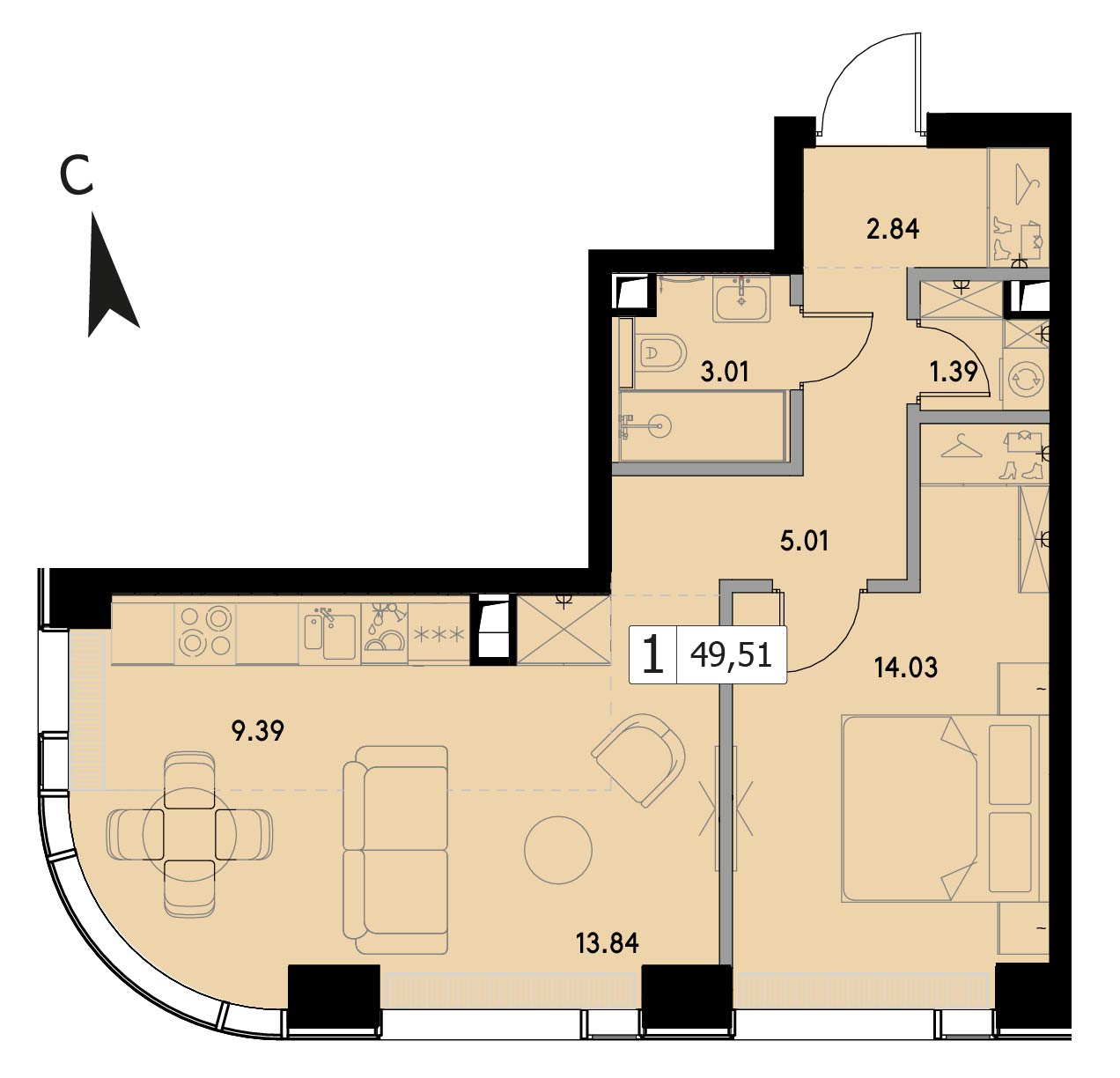 В продаже 1-комнатная квартира без отделки на 23 этаже, Корпус 1.3.