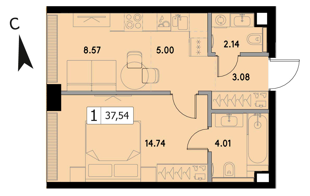 В продаже 1-комнатная квартира без отделки на 28 этаже, Корпус А.