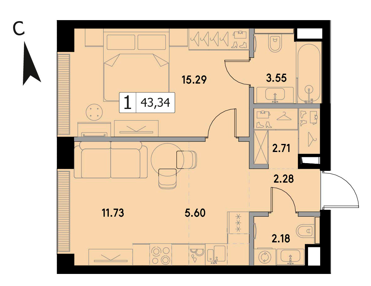 В продаже 1-комнатная квартира без отделки на 16 этаже, Корпус 5.