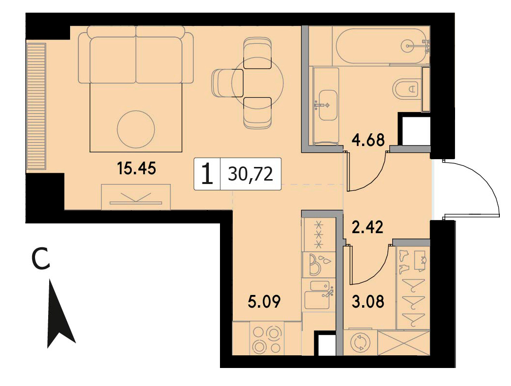 В продаже 1-комнатная квартира без отделки на 29 этаже, Корпус 1.3.