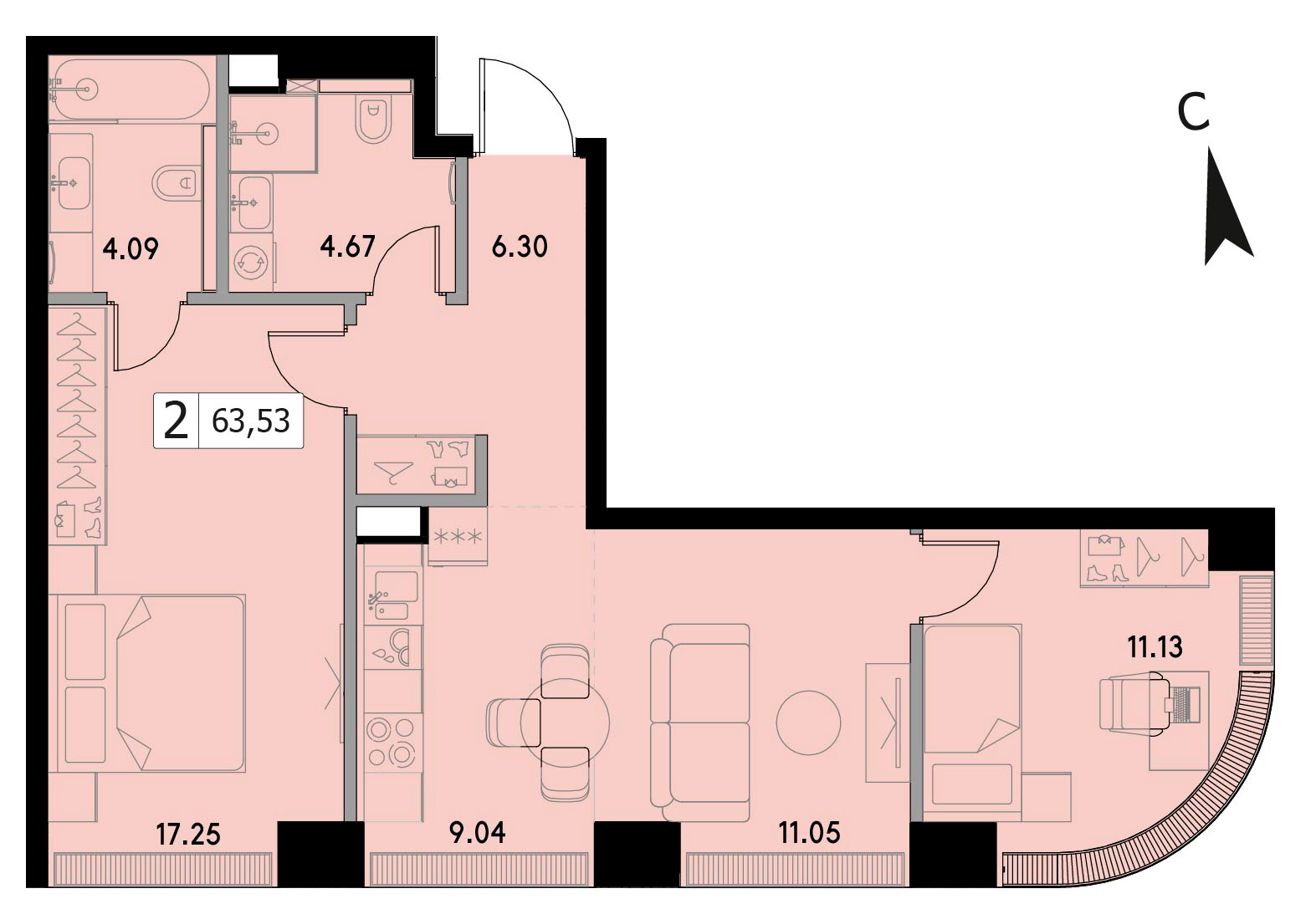 В продаже 2-комнатная квартира без отделки на 54 этаже, Корпус 1.3.