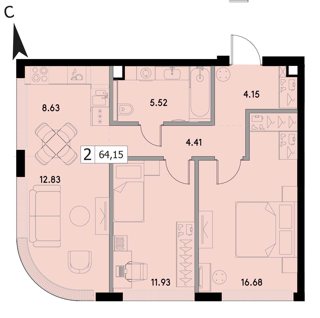 В продаже 2-комнатная квартира без отделки на 26 этаже, Корпус 1.2.