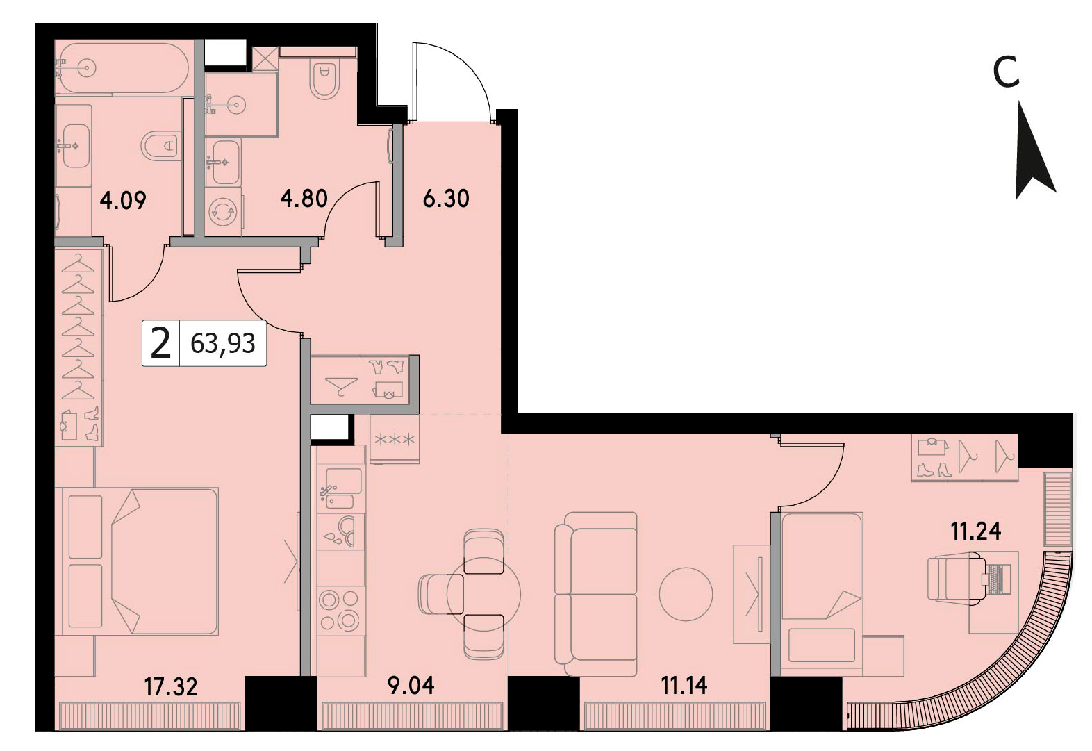 В продаже 2-комнатная квартира без отделки на 20 этаже, Корпус 1.3.