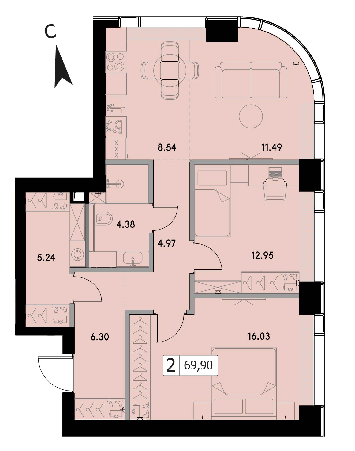 В продаже 2-комнатная квартира без отделки на 16 этаже, Беллини, корп.2.