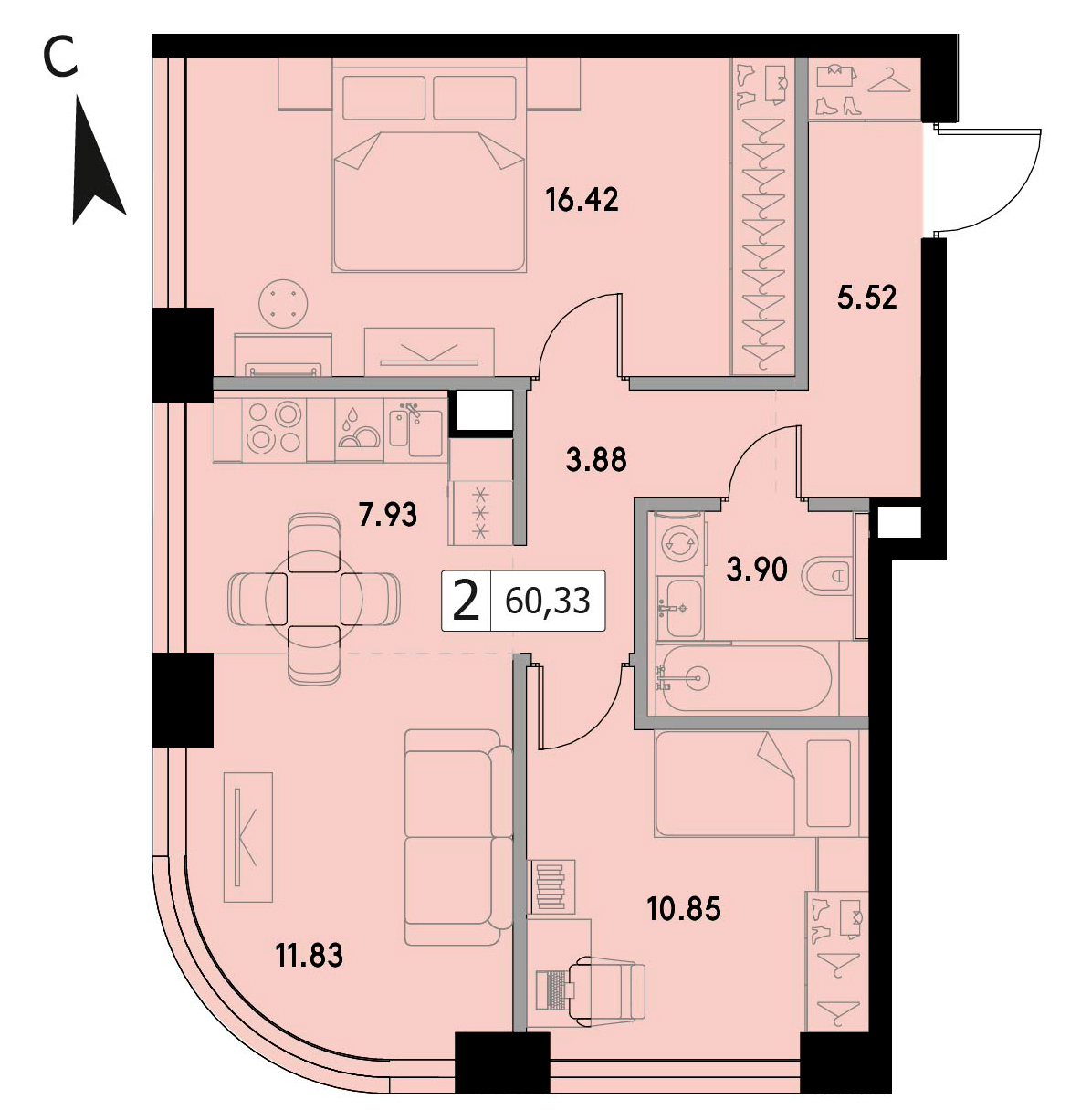 В продаже 2-комнатная квартира без отделки на 25 этаже, Корпус 1.