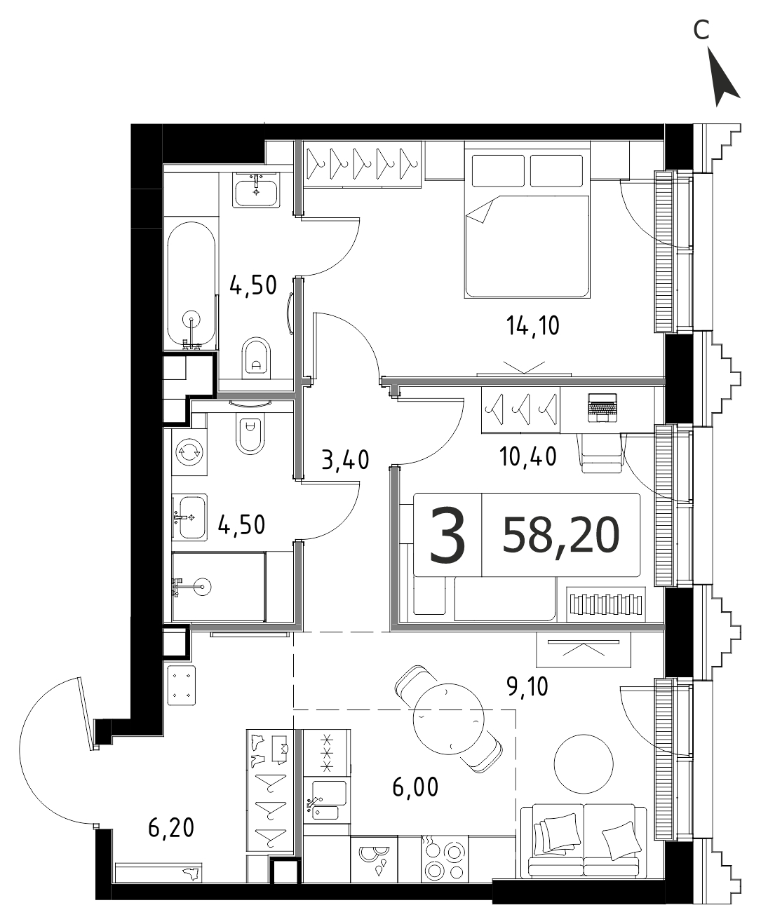 Представляем вашему вниманию 3-комнатная квартира без отделки на 2 этаже, Беллини, корп.3.