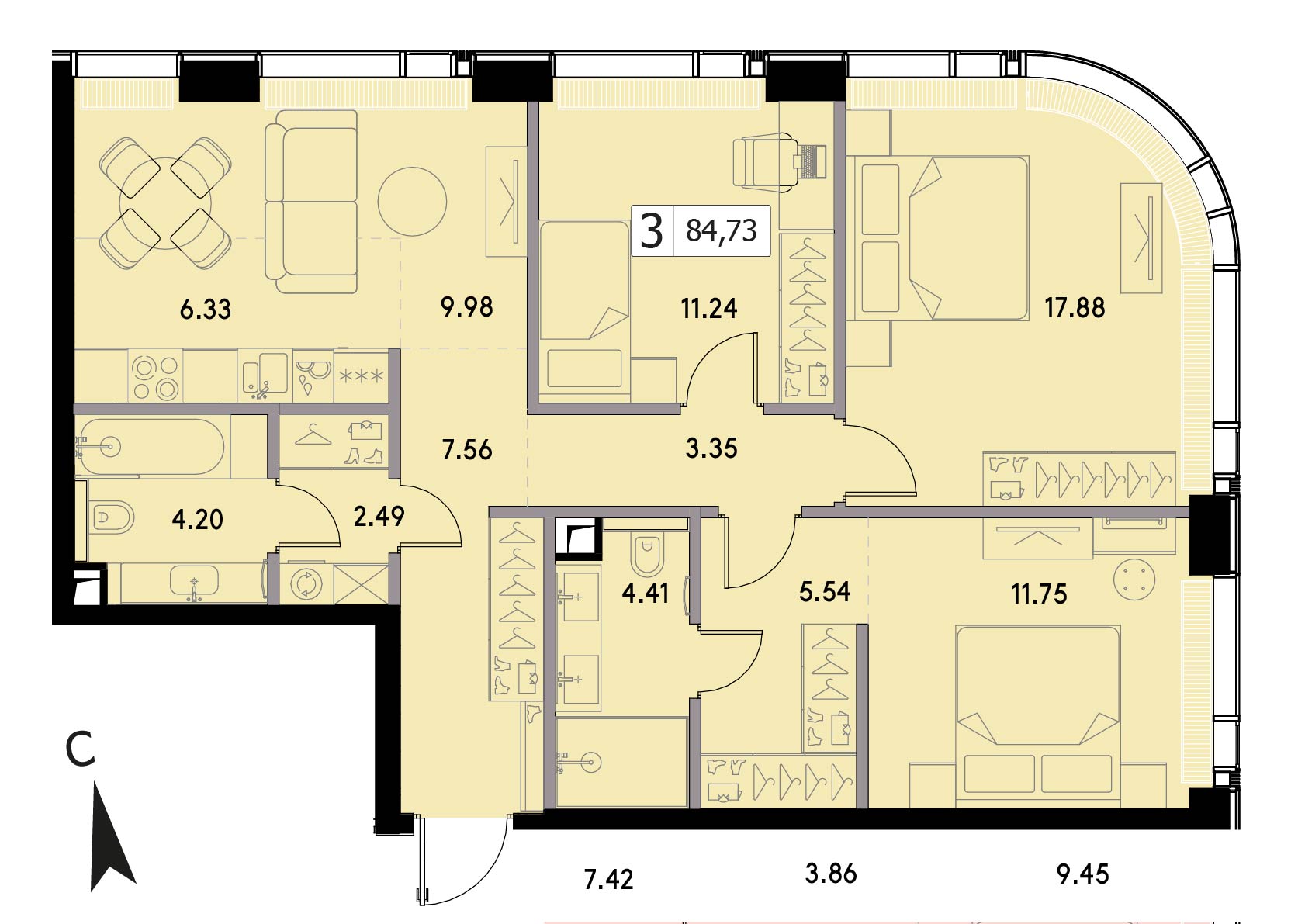 Представляем вашему вниманию 3-комнатная квартира без отделки на 20 этаже, Корпус 1.1.