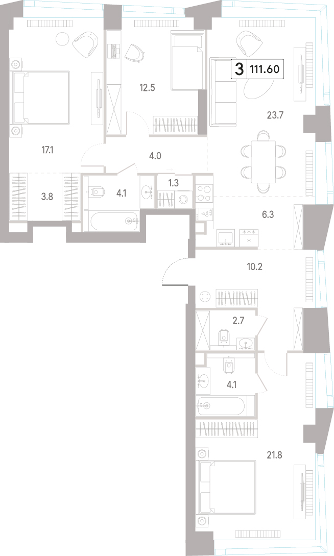 Представляем вашему вниманию 3-комнатная квартира без отделки на 17 этаже, Корпус B.