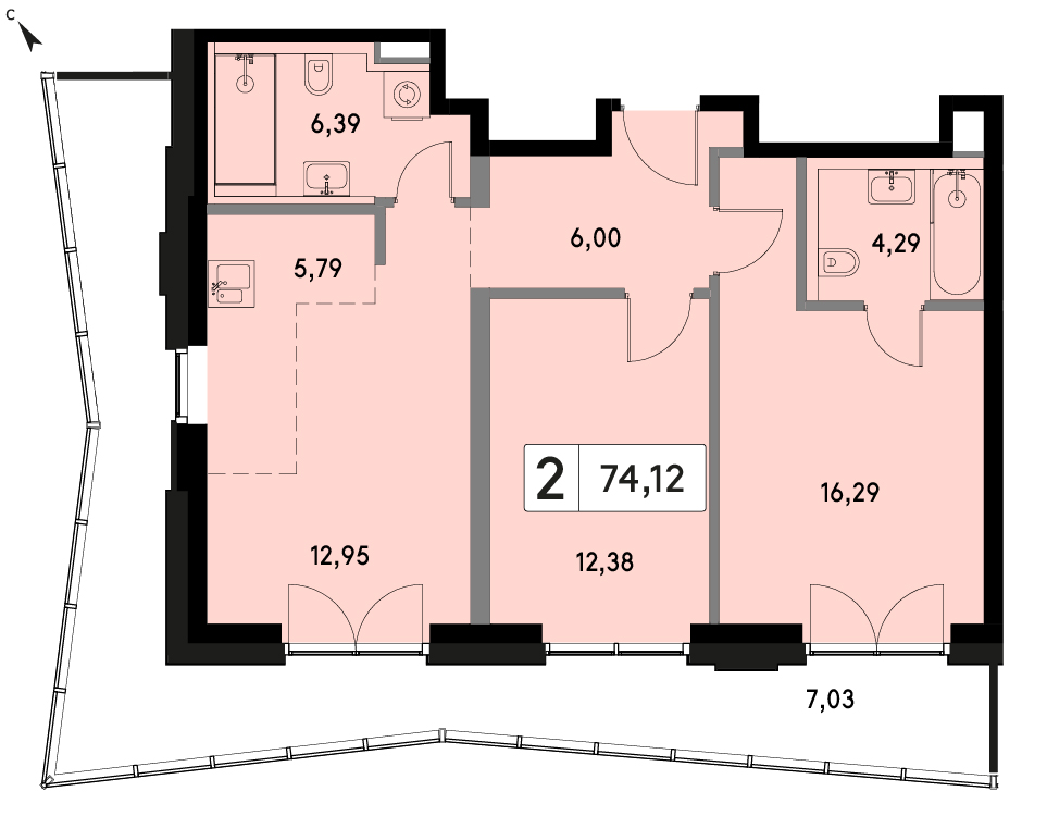 В продаже 2-комнатная квартира без отделки на 6 этаже, Корпус Г.