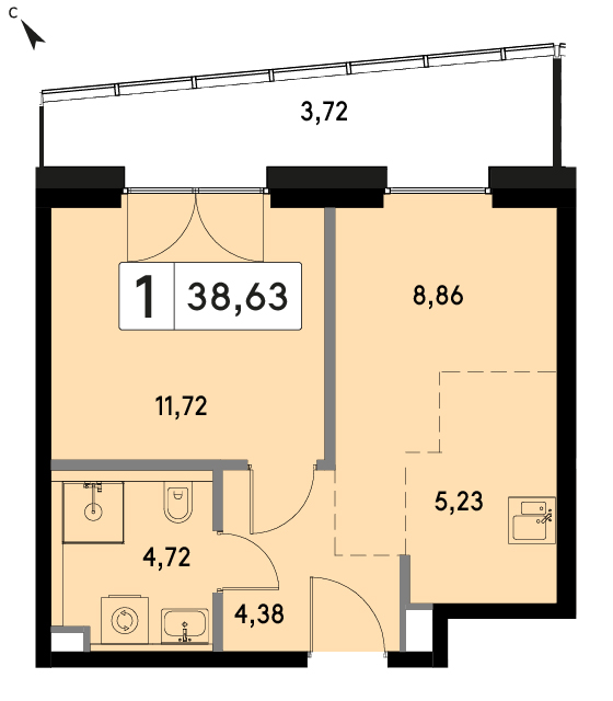 В продаже 1-комнатная квартира без отделки на 27 этаже, Корпус H.