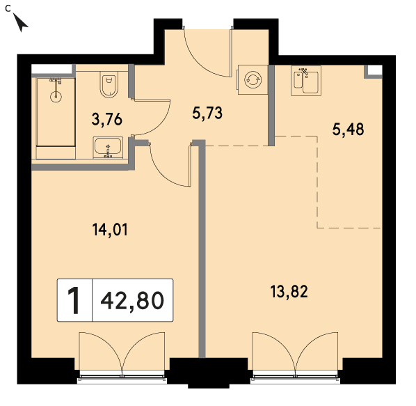 В продаже 1-комнатная квартира без отделки на 17 этаже, Корпус H.