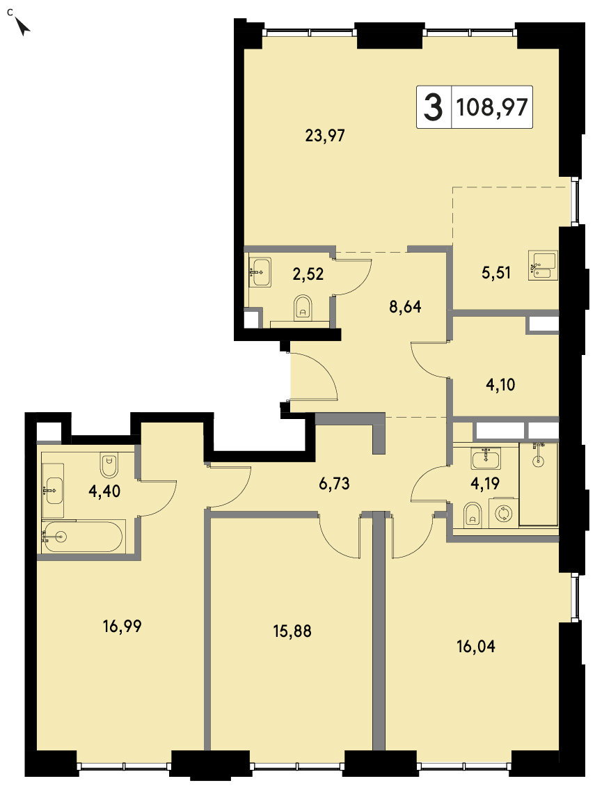 Представляем вашему вниманию 3-комнатная квартира без отделки на 6 этаже, Корпус F.