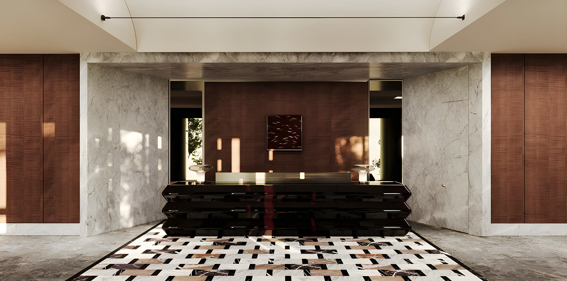 Лобби выполнено в формате приватной гостиной. Высокие потолки, натуральные материалы и мягкий свет создают атмосферу спокойствия с первых шагов. Это не транзитное пространство, а место для встреч, ожидания и коротких пауз в течение дня.