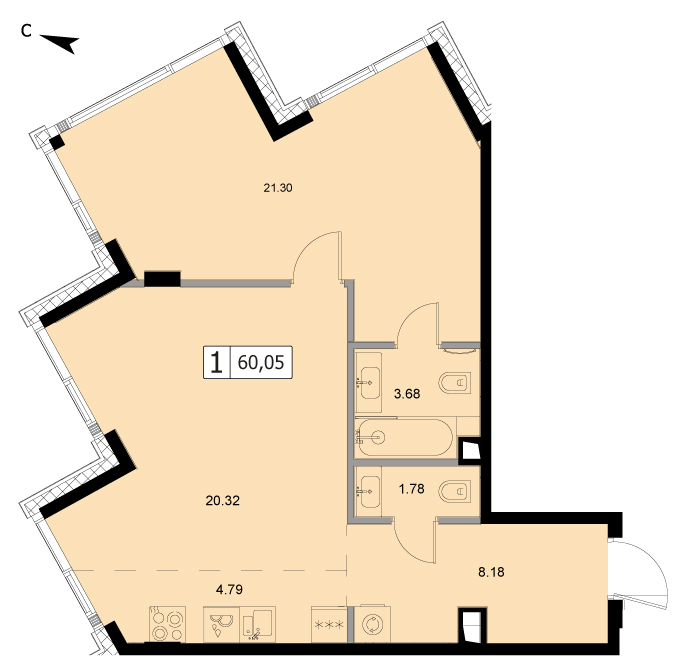 Однокомнатная квартира №445, 67.1 м², 34 этаж, Жилой комплекс «MOD» (МОД)