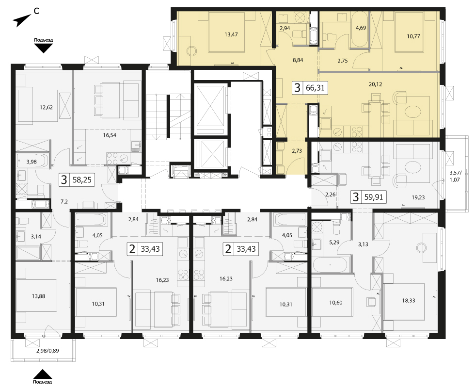 Комфортная трехкомнатная квартира квартира площадью 66.5 м² без отделки.