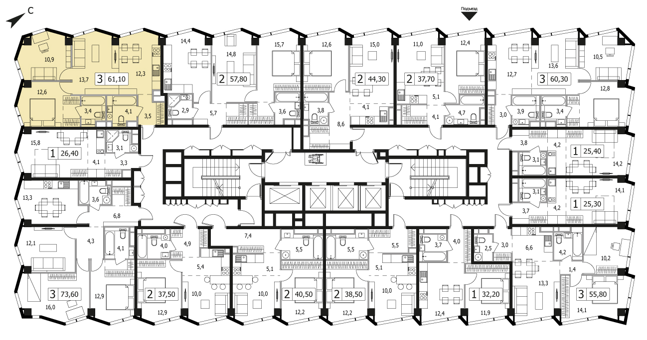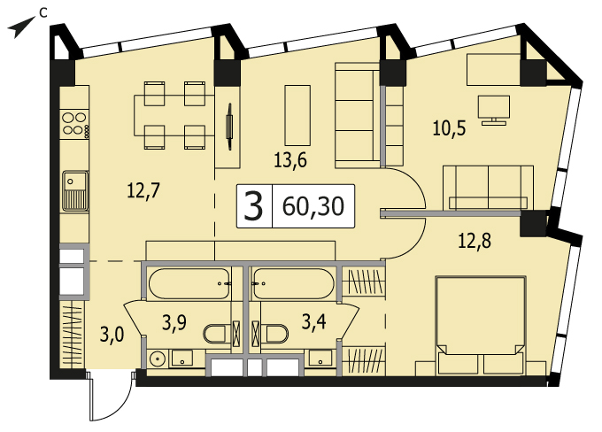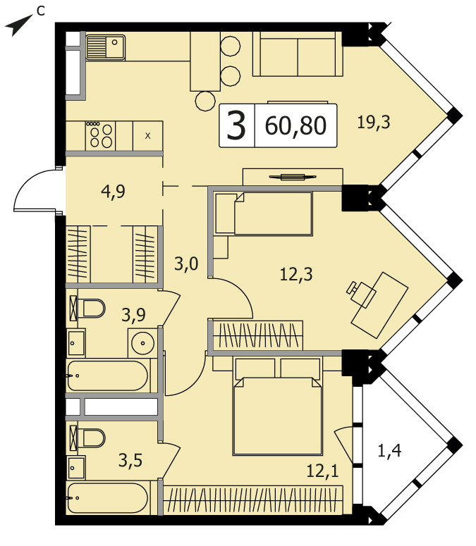 Двухкомнатная квартира №630, 61.1 м², 20 этаж, Жилой комплекс «INDY TOWERS» (Инди Тауэрс)