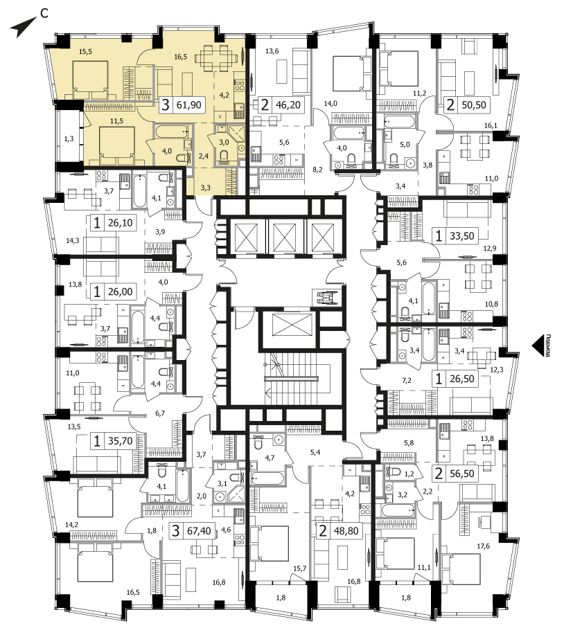 Двухкомнатная квартира №876, 61.9 м², 16 этаж, Жилой комплекс «INDY TOWERS» (Инди Тауэрс)