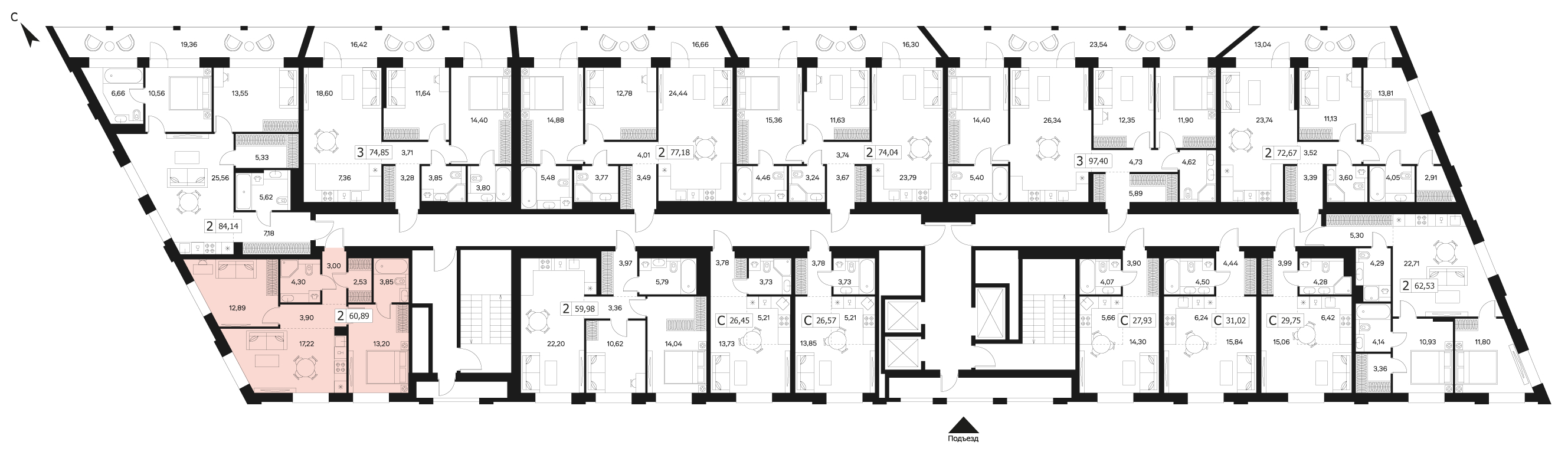 - Двухкомнатная квартира 60.7м², 2 этаж