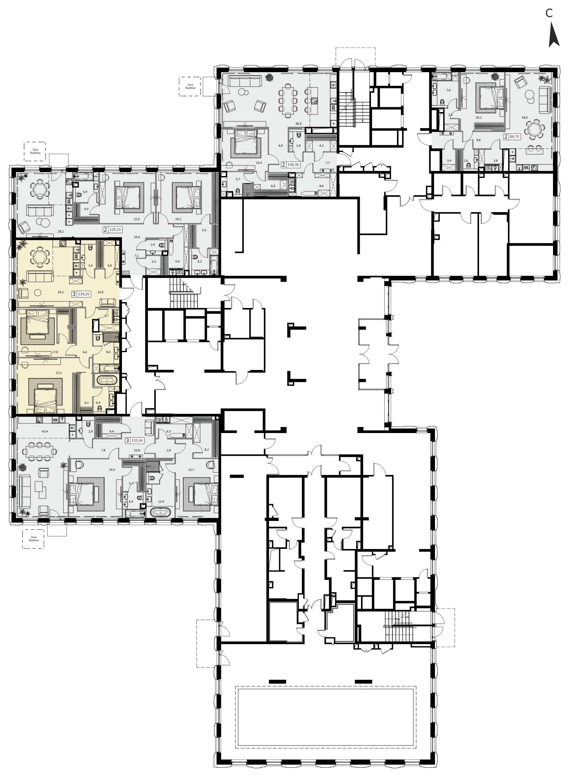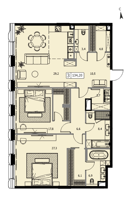 - Трехкомнатная квартира 134.2м², 1 этаж