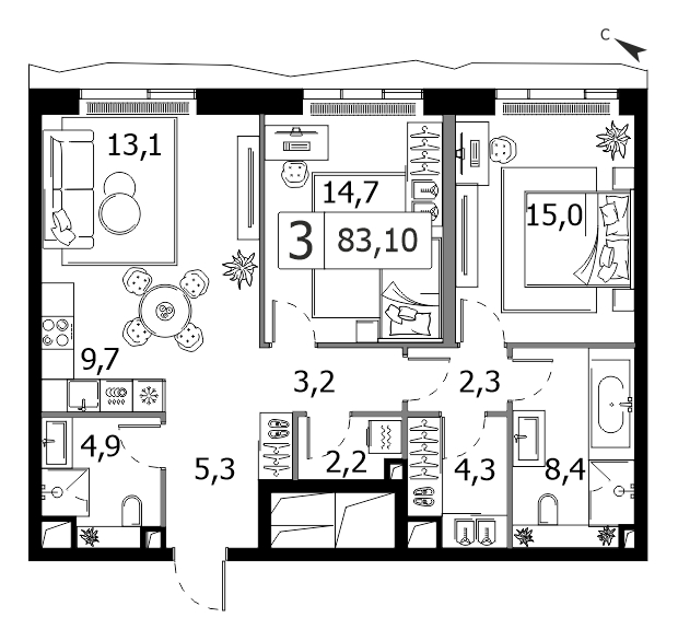 Трехкомнатная квартира №882, 87 м², 18 этаж, Жилой комплекс «PRIDE» (Прайд)