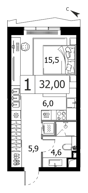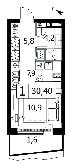 Однокомнатная квартира №279, 32.3 м², 9 этаж, Жилой комплекс «PRIDE» (Прайд)