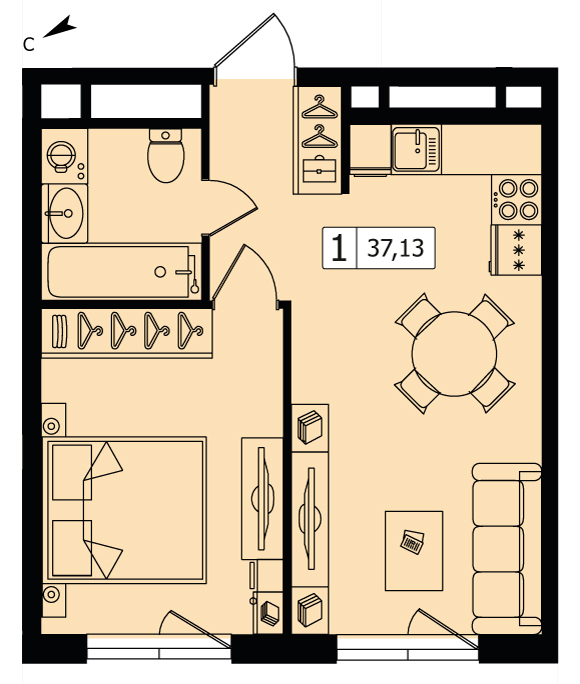 Однокомнатный апартамент №215, 38.4 м², 19 этаж, Жилой квартал Зорге 9