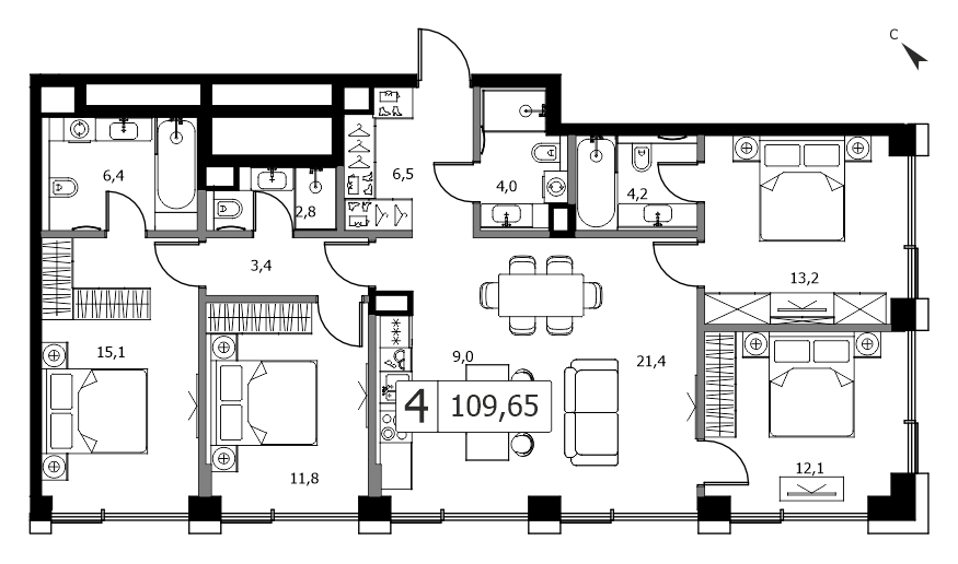 Комфортная четырехкомнатная квартира квартира площадью 105.26 м² с отделкой . Лот расположен на 43 этаже, корпуса North 1 ЖК «Сити Бэй» (City Bay).Комплекс находится по адресу: г. Москва, Волоколамское ш., д.95-97, срок сдачи 2027г.. Это соединение удобной инфраструктуры городской застройки и зеленых зон отдыха.