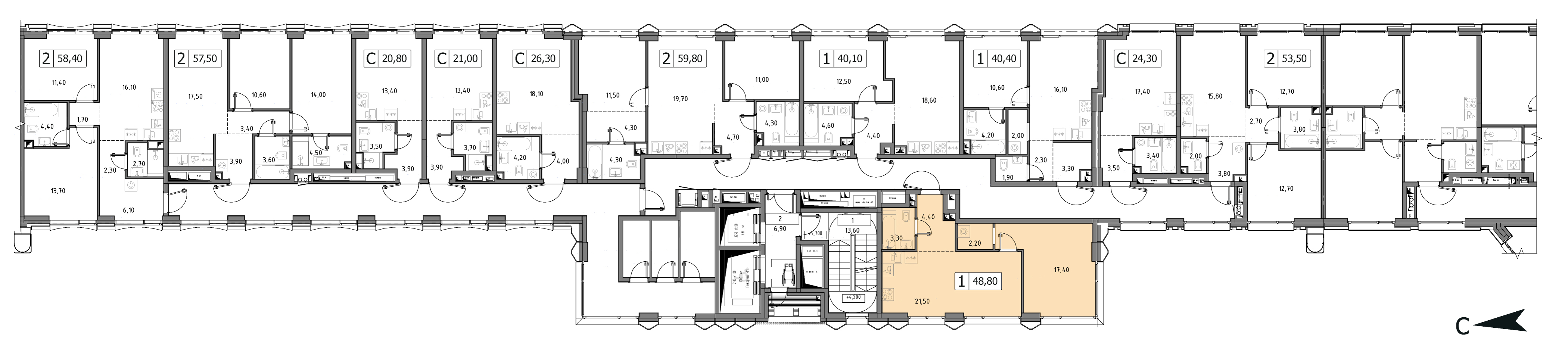Комфортная однокомнатная квартира квартира площадью 48.8 м² без отделки. Лот расположен на 2 этаже, корпуса 5 ЖК «СитиЗен» (Cityzen).Комплекс находится по адресу: г. Москва, Вишневая, срок сдачи 2027г.. Это соединение удобной инфраструктуры городской застройки и зеленых зон отдыха.