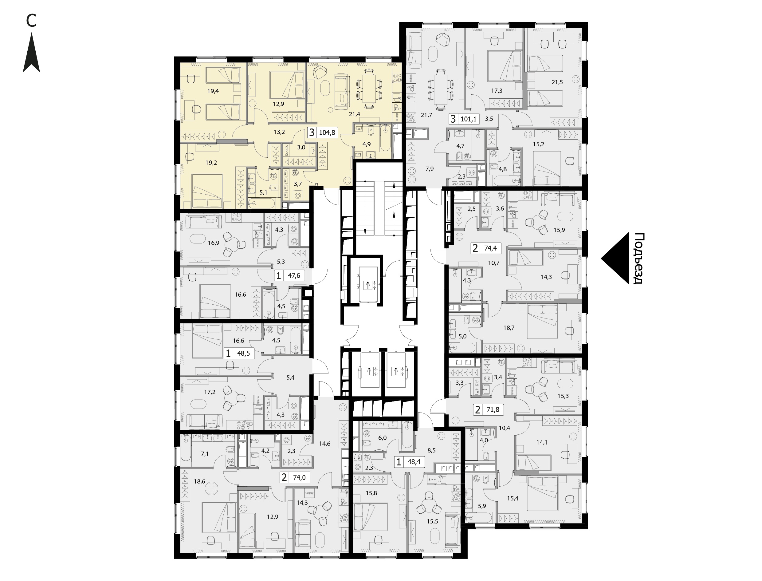 - Трехкомнатная квартира 102.8м², 3 этаж