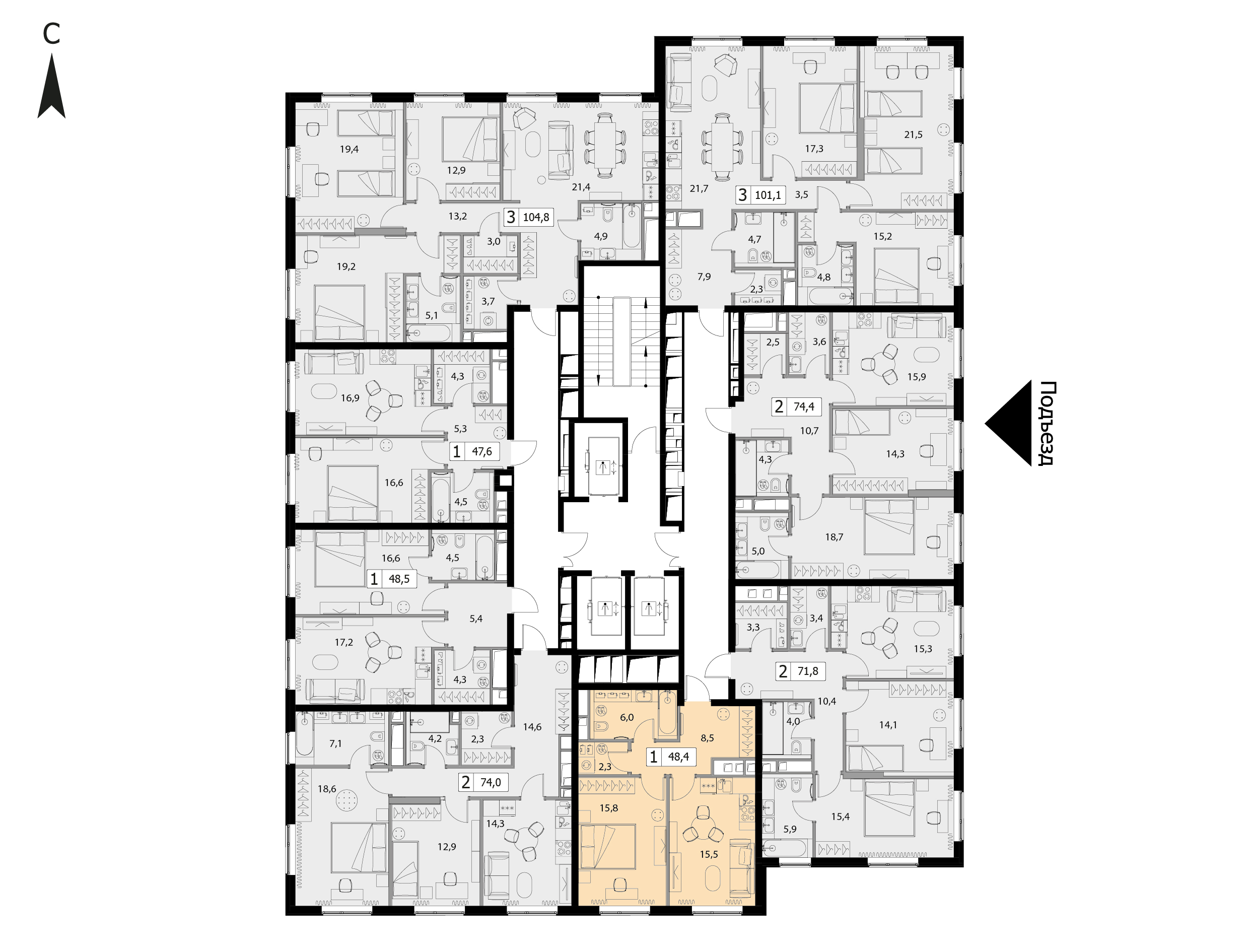 Двухкомнатная квартира №39, 75 м², 6 этаж, Жилой комплекс «Интонация»