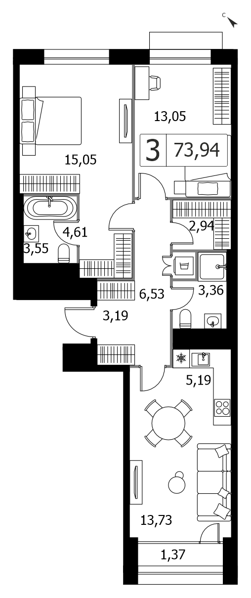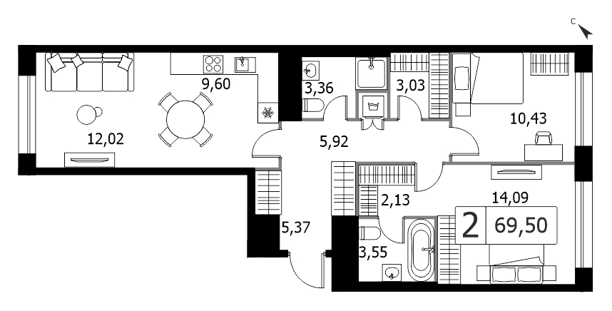 Двухкомнатная квартира 69.23 м², 3 этаж, ЖК «ЛАЙФ Варшавская» (LIFE)