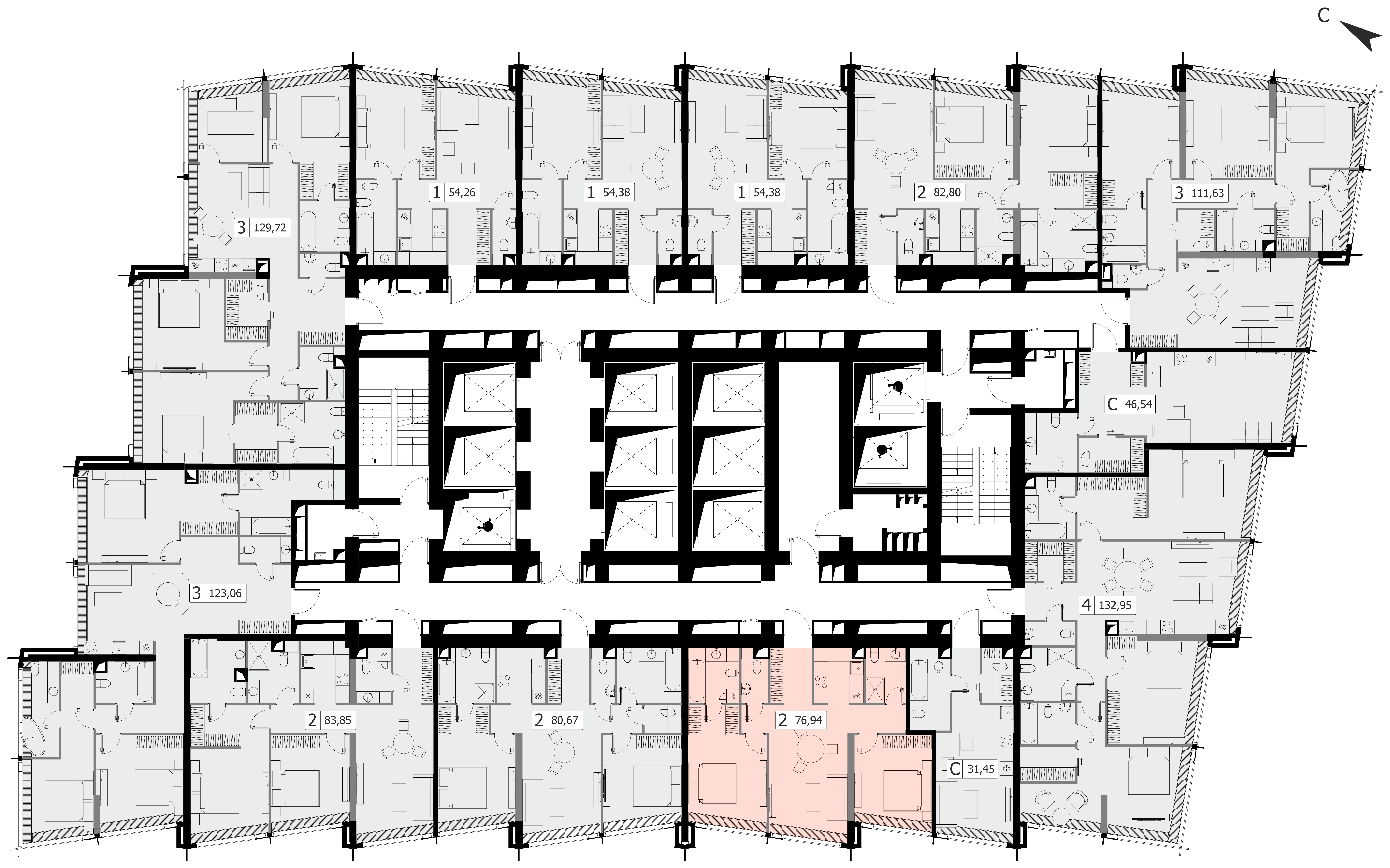 Комфортная двухкомнатная квартира квартира площадью 78.59 м² без отделки. Лот расположен на 30 этаже, корпуса 1 МФК «Дом Дау».Комплекс находится по адресу: г. Москва, Пресненская наб., вл. 14/15, срок сдачи 2027г.. Это соединение удобной инфраструктуры городской застройки и зеленых зон отдыха.