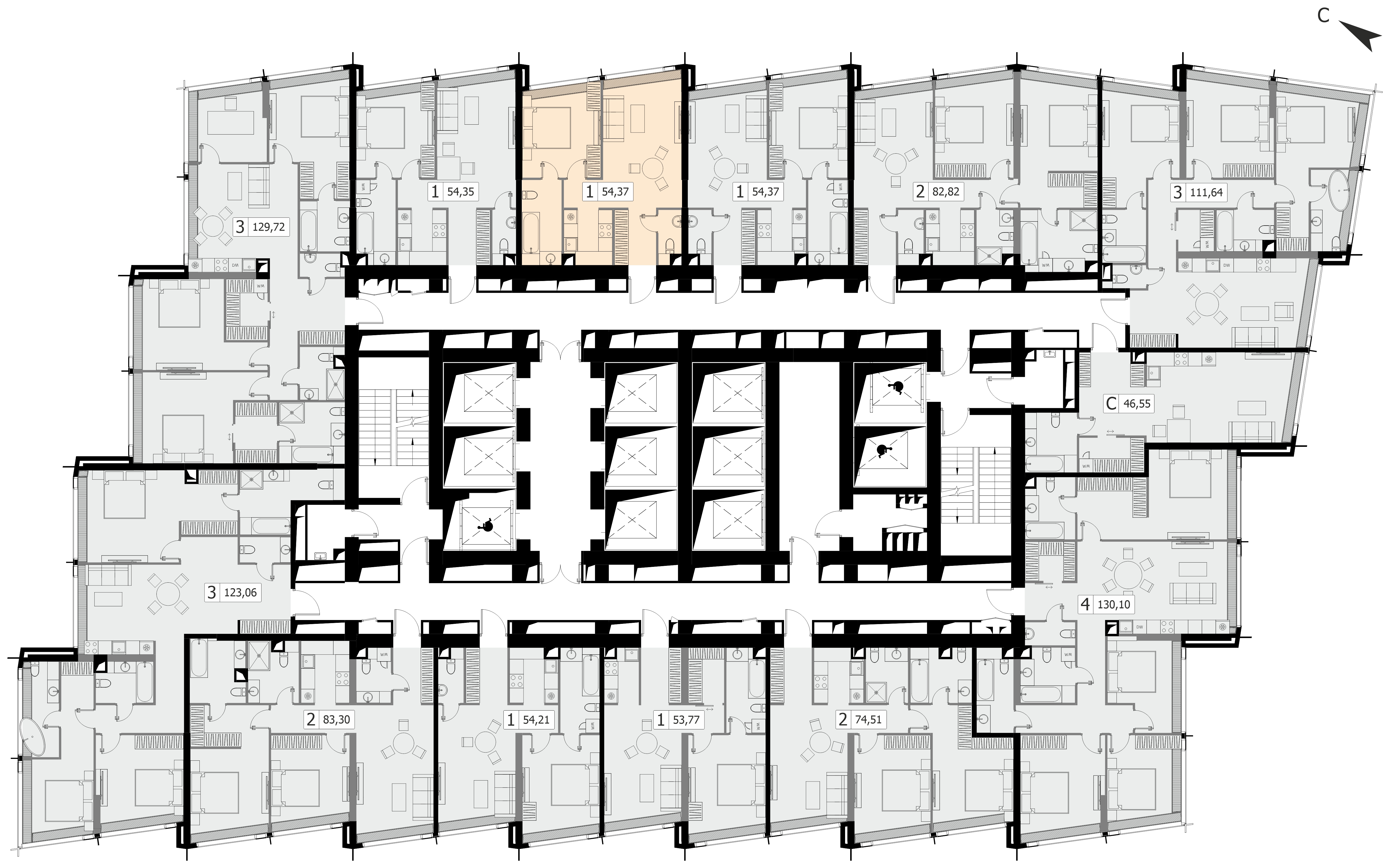 Комфортная однокомнатная квартира квартира площадью 54.37 м² без отделки. Лот расположен на 34 этаже, корпуса 1 МФК «Дом Дау».Комплекс находится по адресу: г. Москва, Пресненская наб., вл. 14/15, срок сдачи 2027г.. Это соединение удобной инфраструктуры городской застройки и зеленых зон отдыха.