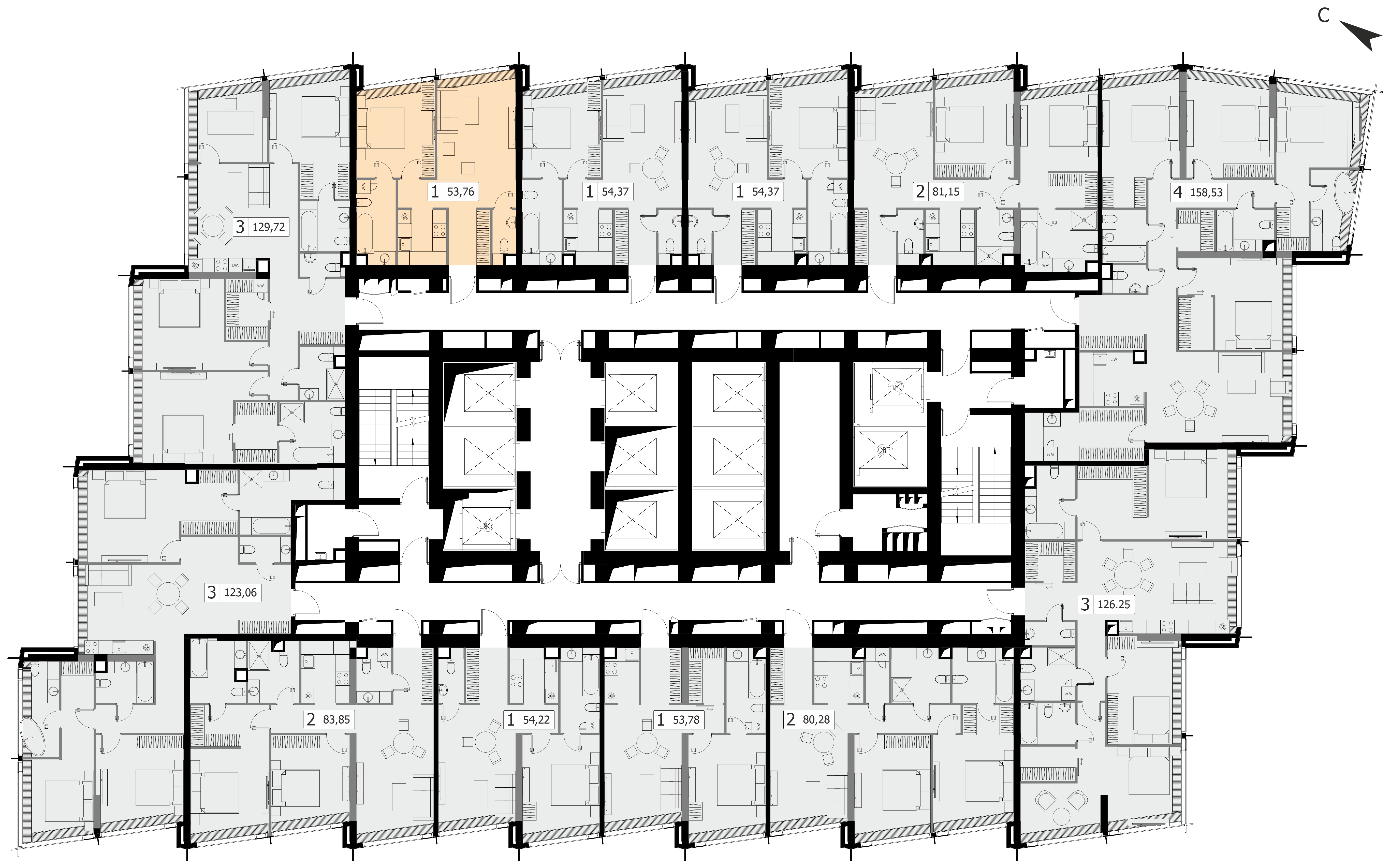 Комфортная трехкомнатная квартира квартира площадью 83.85 м² без отделки. Лот расположен на 40 этаже, корпуса 1 МФК «Дом Дау».Комплекс находится по адресу: г. Москва, Пресненская наб., вл. 14/15, срок сдачи 2027г.. Это соединение удобной инфраструктуры городской застройки и зеленых зон отдыха.
