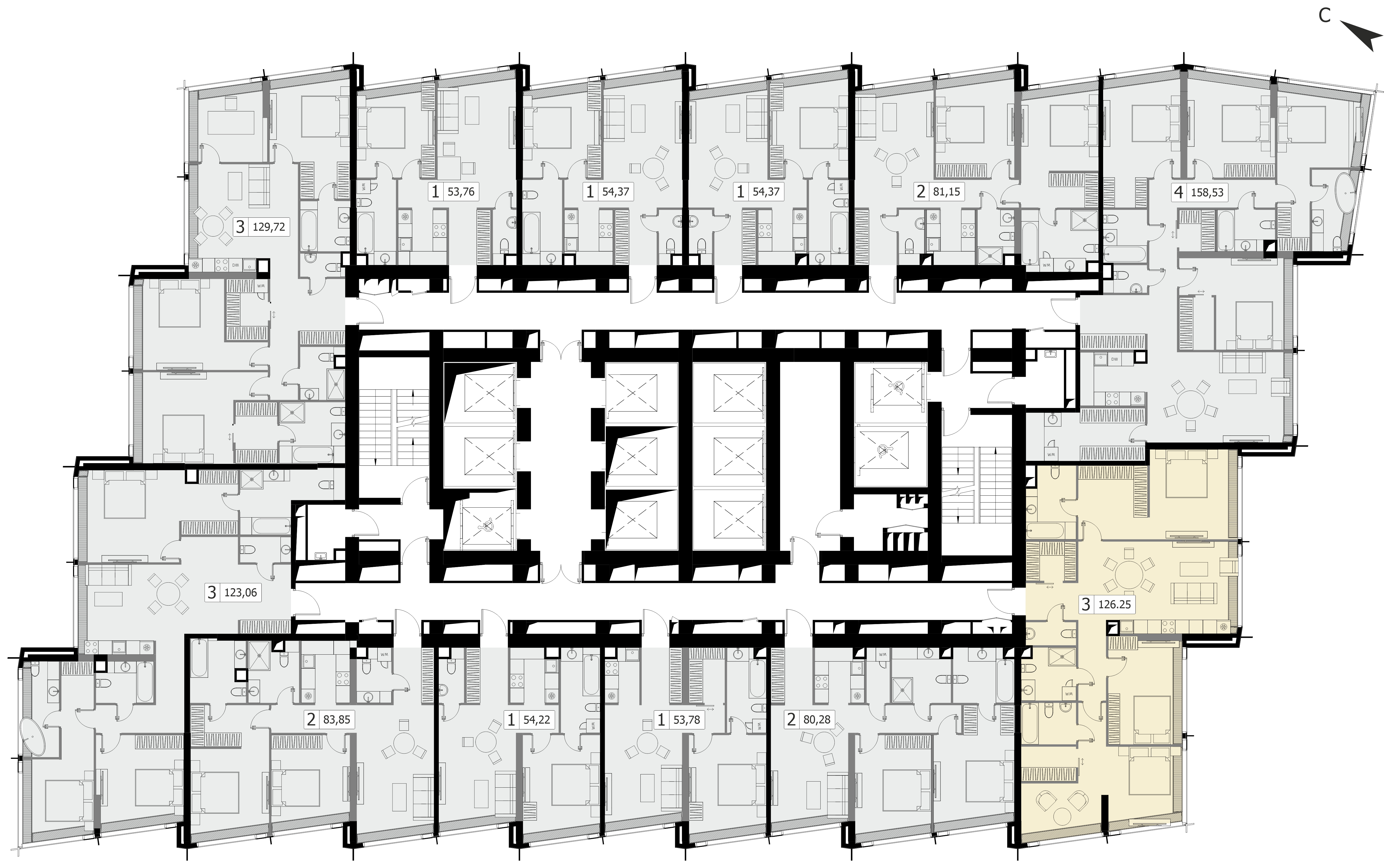 Комфортная трехкомнатная квартира квартира площадью 130.72 м² без отделки. Лот расположен на 44 этаже, корпуса 1 МФК «Дом Дау».Комплекс находится по адресу: г. Москва, Пресненская наб., вл. 14/15, срок сдачи 2027г.. Это соединение удобной инфраструктуры городской застройки и зеленых зон отдыха.