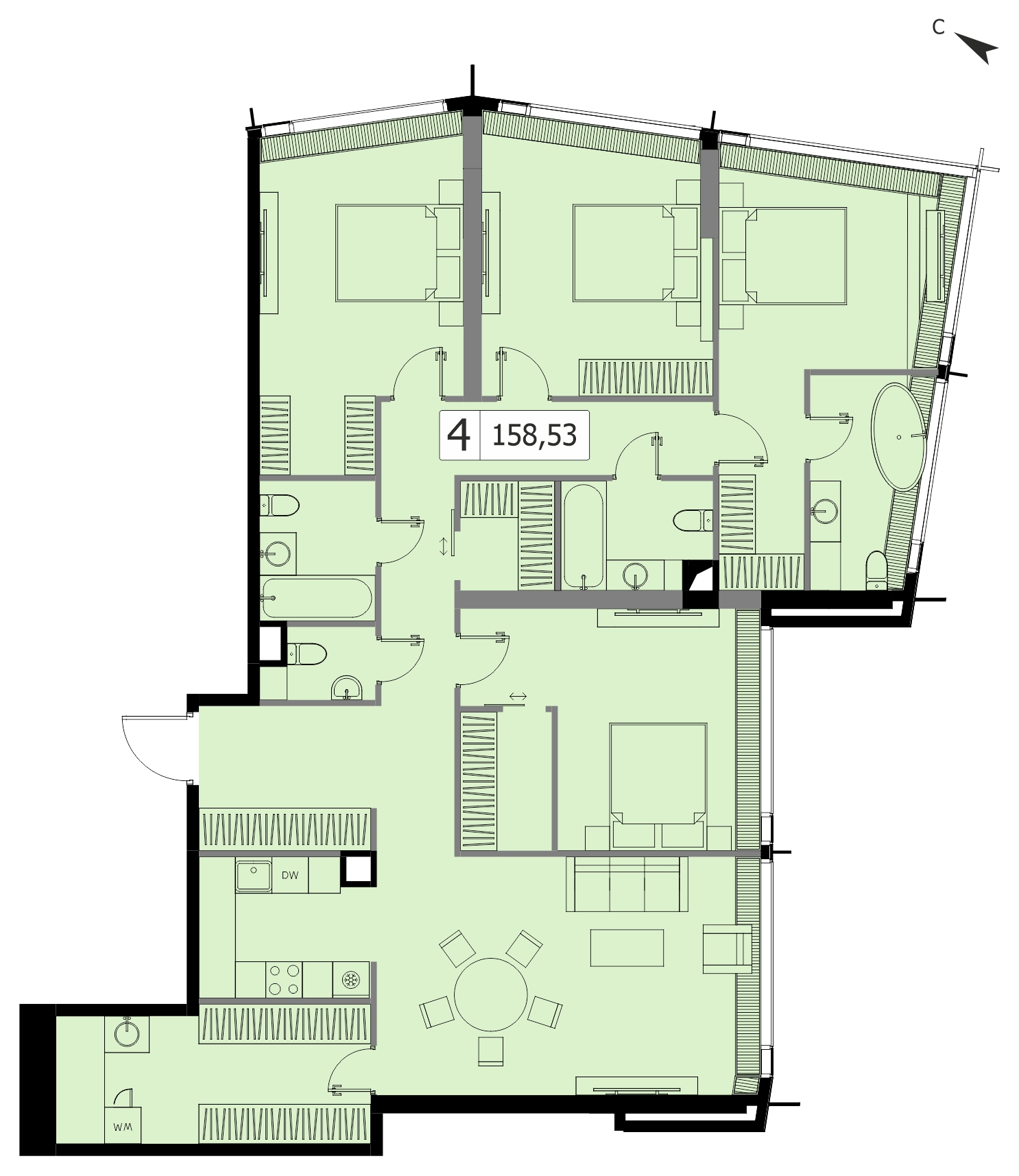 Комфортная четырехкомнатная квартира квартира площадью 161.34 м² без отделки. Лот расположен на 45 этаже, корпуса 1 МФК «Дом Дау».Комплекс находится по адресу: г. Москва, Пресненская наб., вл. 14/15, срок сдачи 2027г.. Это соединение удобной инфраструктуры городской застройки и зеленых зон отдыха.