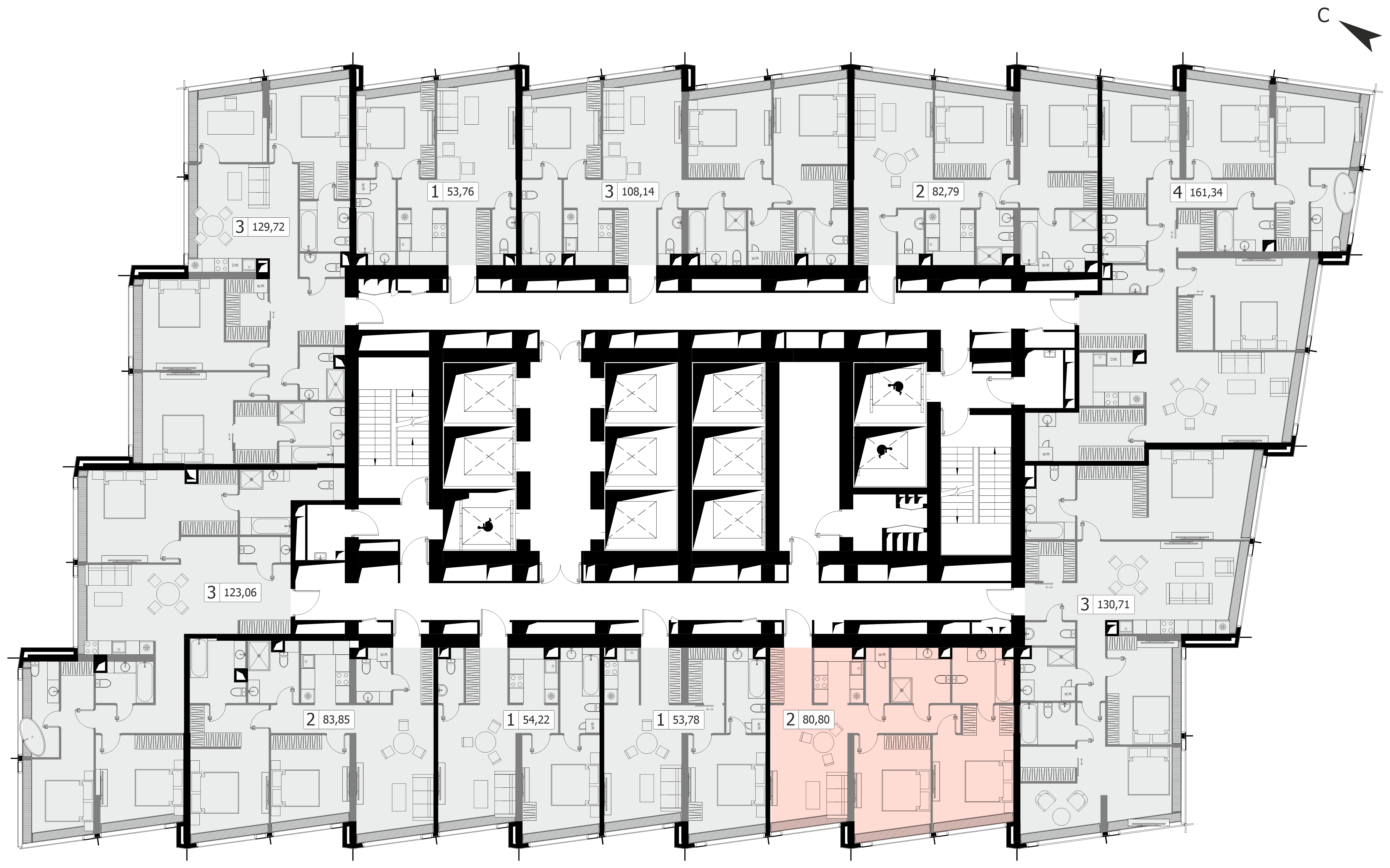 Комфортная двухкомнатная квартира квартира площадью 80.8 м² без отделки. Лот расположен на 46 этаже, корпуса 1 МФК «Дом Дау».Комплекс находится по адресу: г. Москва, Пресненская наб., вл. 14/15, срок сдачи 2027г.. Это соединение удобной инфраструктуры городской застройки и зеленых зон отдыха.